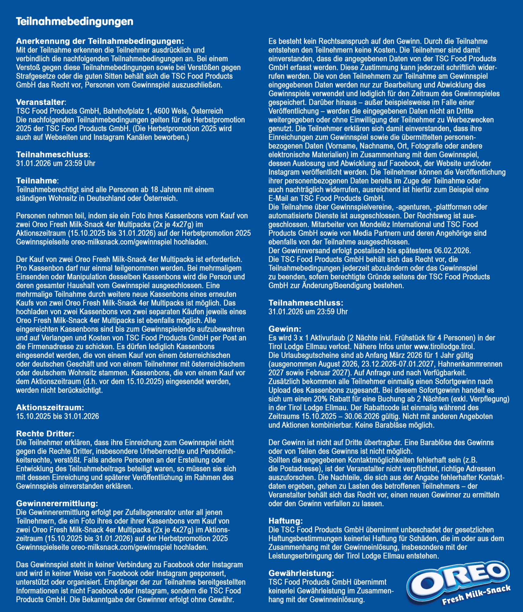 Am besten gleich ab zum Kühlregal, unseren Oreo Fresh Milk-Snack mit knuspriger Cookie Chunks und frischer Milchcreme holen und ganz easy teilnehmen!